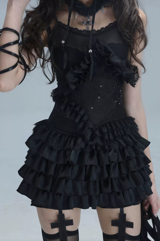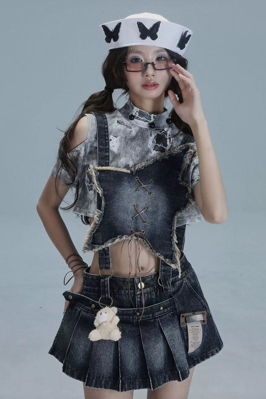Y2Kスターデニムオーバーオールスカート+インナートップス