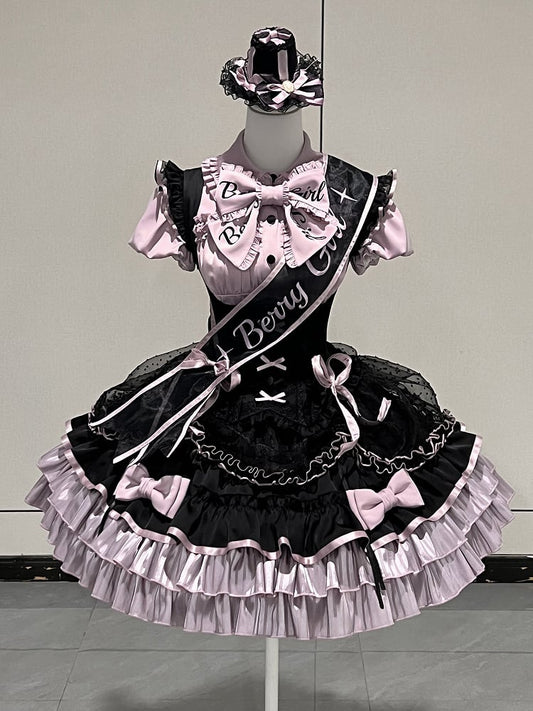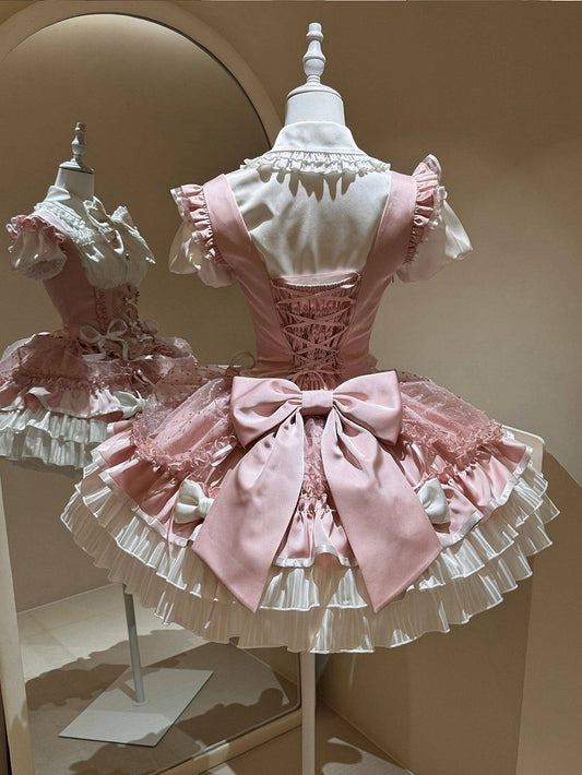 【5月12日予約締切】ピンクホワイトスイートロリータアイドルリボンパフスリーブシャツ+コルセットチュールプルアップJKSドレスセットアップ