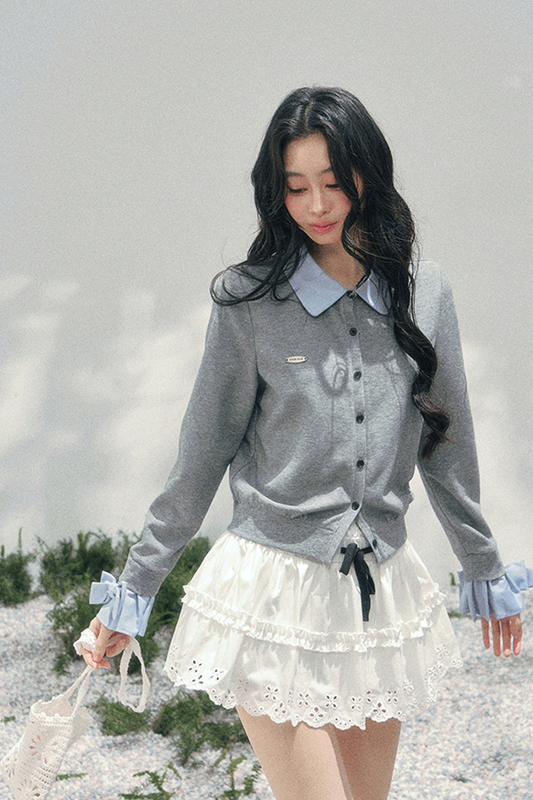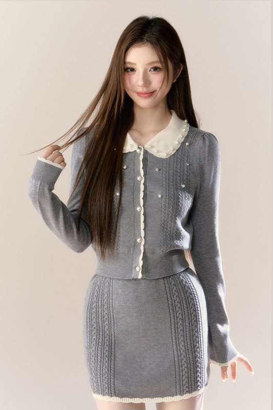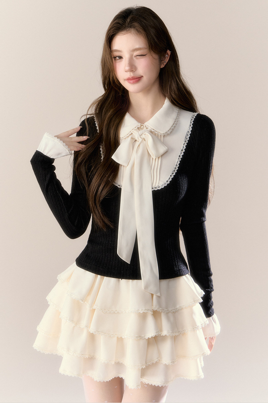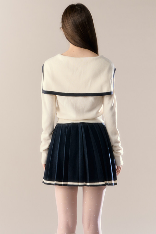 【数量限定】セーラーカラースイーツプリントドレス+Vネックフリルニットカーディガン