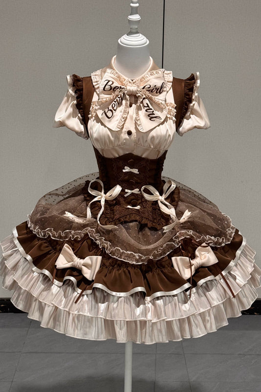 【5月12日予約締切】カフェモカロリータアイドルリボンパフスリーブシャツ+コルセットチュールプルアップJKSドレスセットアップ