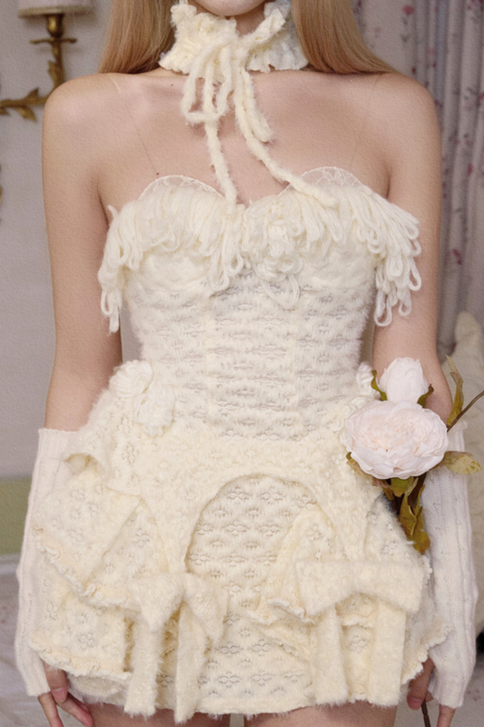 レトロ和袖ニットカーディガン+フリルスタンドカラーシャツ+ベストドレス+リボン+コサージュ