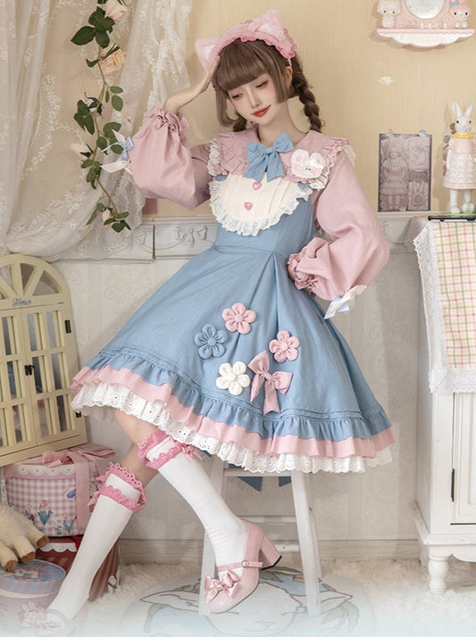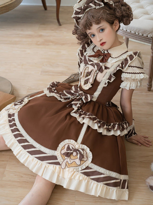 スイートチョコレートロリータスカート+フリルブラウス+レースショートアームウォーマー+リボンカチューシャ
