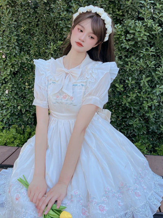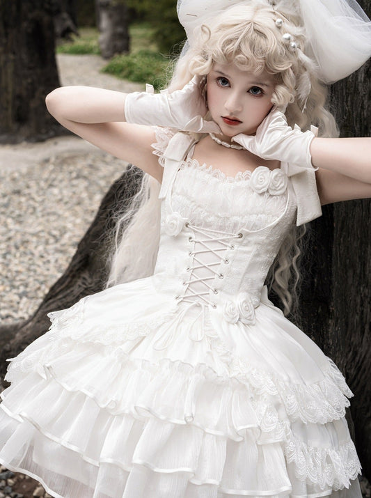 スチームコンチネンタルジャカードピュアコットンレースレトロハイウエストリトルホワイトドレス