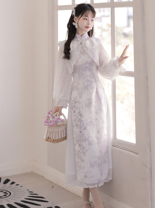 シアーカーディガン+フラワーチャイナドレス+プリーツスカート