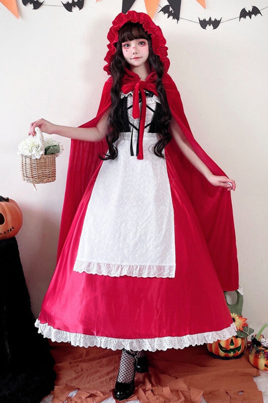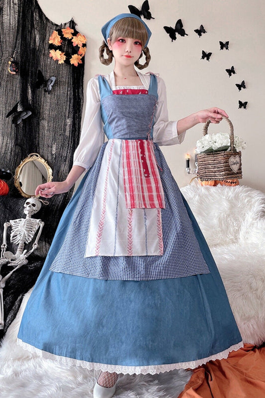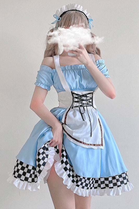 チェックワンピース+メイドエプロン+ヘアアクセサリー+ヘアバンド+アームバンド+リボン6点セット