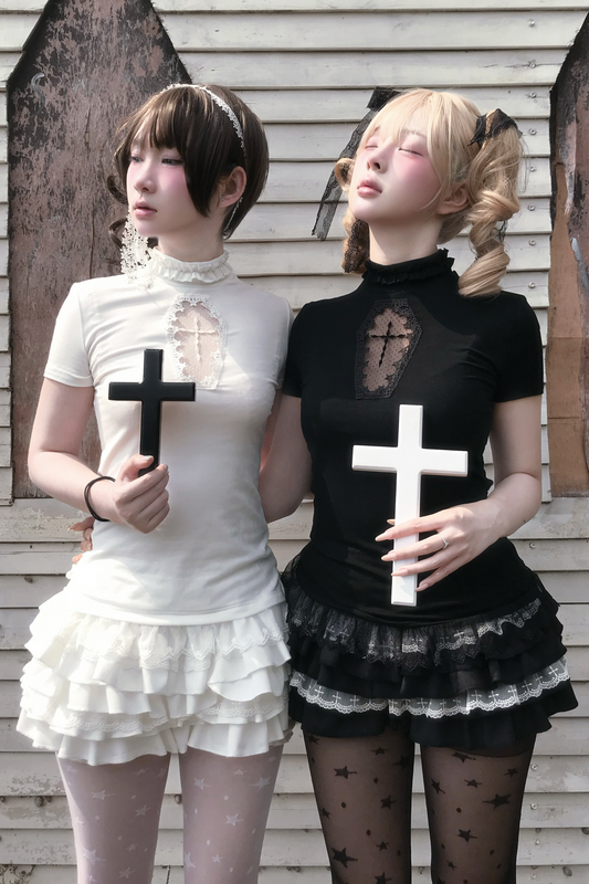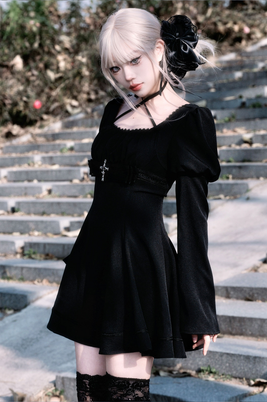 【予約商品】チョーカーネックスクエアフリルニットトップス+ゴシッククロスレースアップスカート