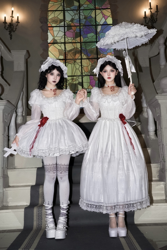 ゴシックツインズロリータドレス+ハンドスリーブ+ネックレス+ヘッドバンド+ベール+コルセット+取り外し可能カーテン+コサージュ