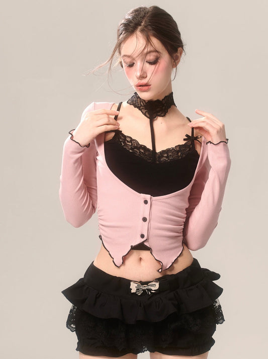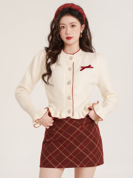 ショートフリルレッドホワイトニットカーディガン