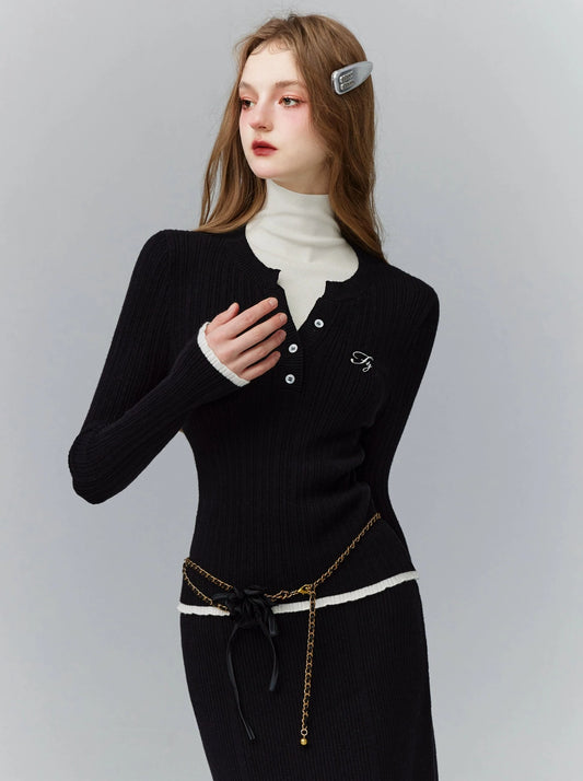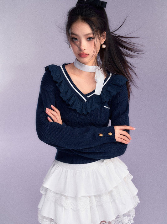 スリムケーブルフリルカラーニットトップス【予約商品】
