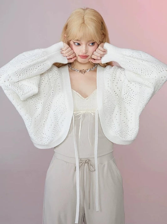 ミルクホワイトバットスリーブショートレースアップニットカーディガン