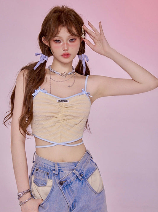 サマースイートハートクリームイエローストライプクロップドキャミソール