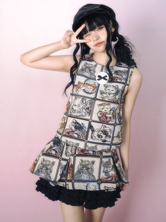 キャットコラージュデザインレトロジャガードノースリーブジャケットベスト