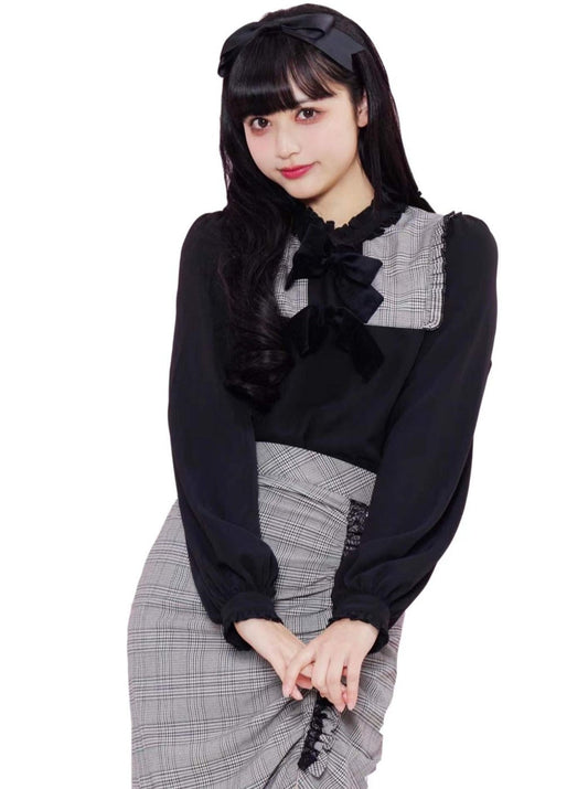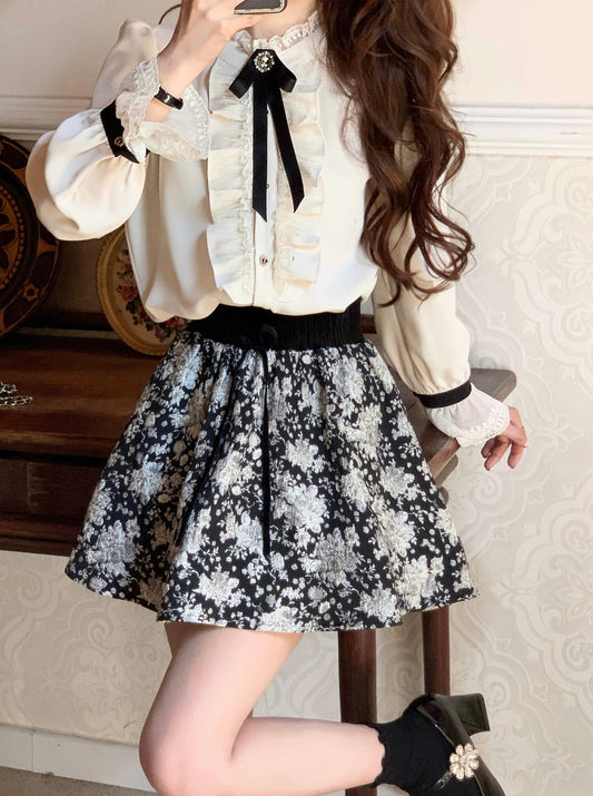 ジャカードレースメッシュシースルーパフスリーブトップス