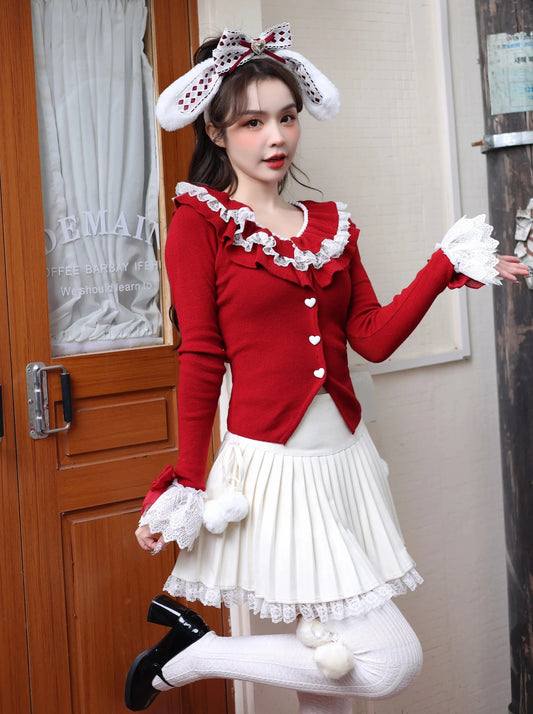 レッドオープンネックレースカーディガン