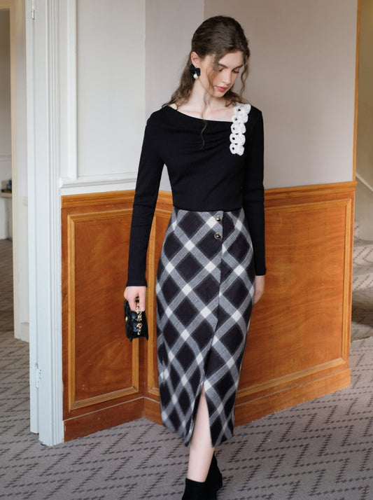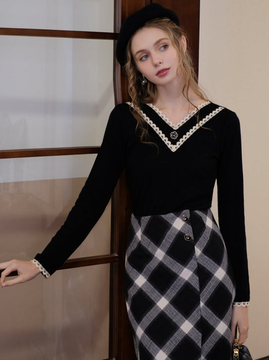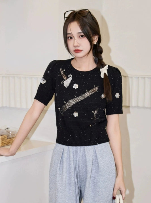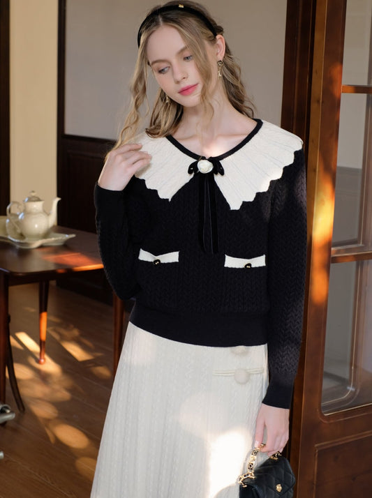 ブラックホワイトスイートリボン透かし編みニット