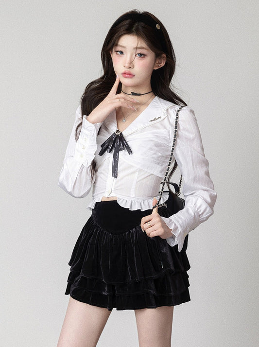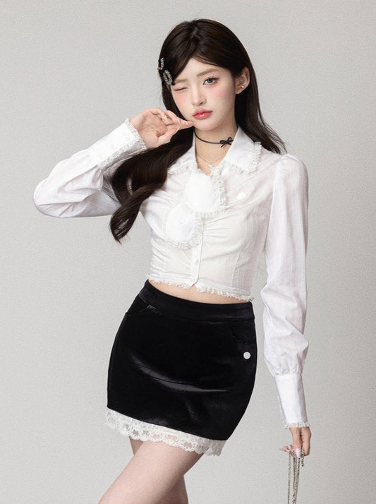 ホワイトフェアリーボリュームシアースリーブオフショルダートップス++レーススカート
