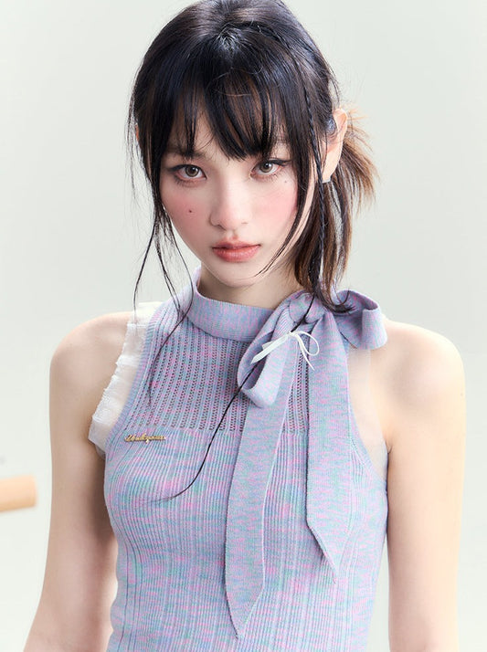 ネックリボンノースリーブウエストスリットトップス