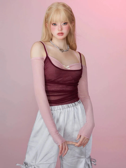 オフショルダーカラーブロックシアーメッシュフェイクツーピースクロップトップTシャツ