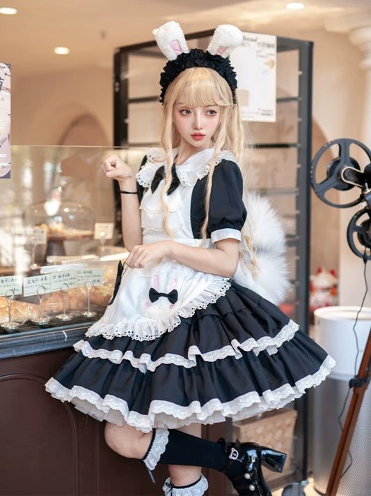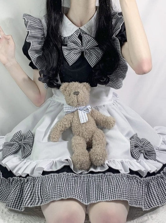 ブラックホワイトフリルメイドリボンドレス
