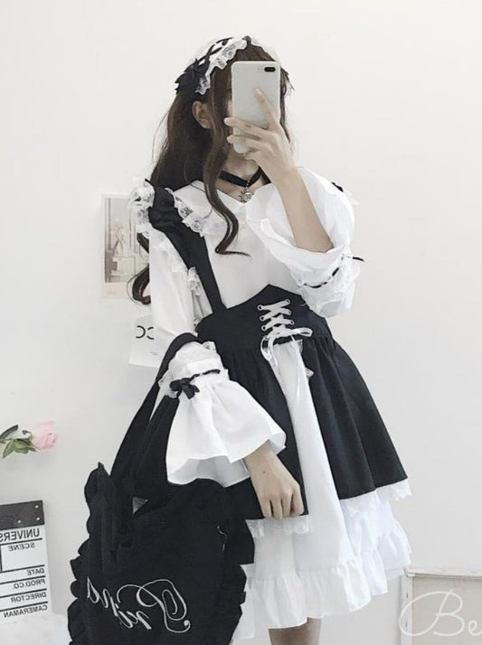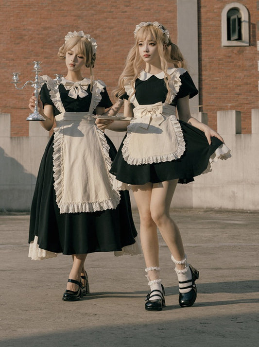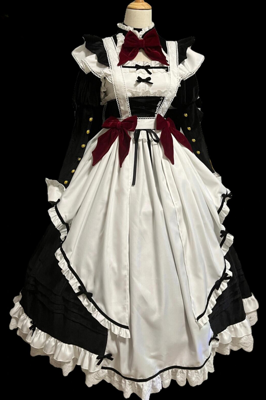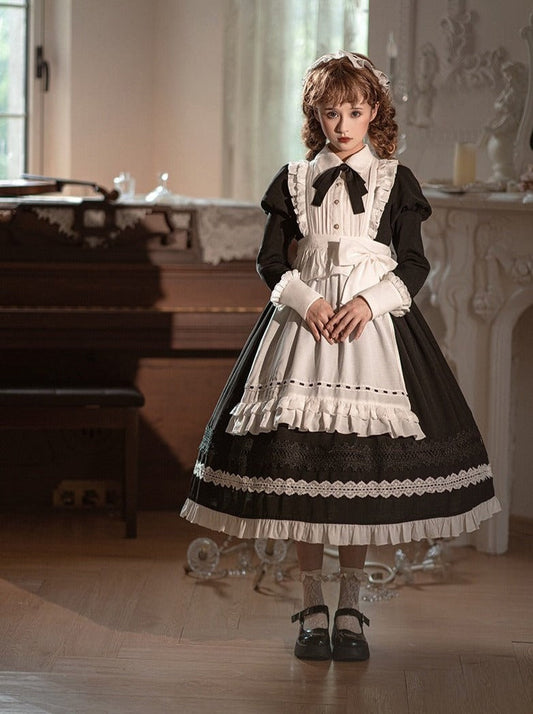 フロントリボンランタンロングスリーブメイドドレス+フリルビッグリボンエプロン