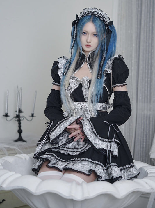 シルバードラゴンメイドゴシックドレス+エプロン+アームカバー