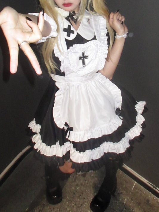 ドールカラークロスハートロリータメイドエプロンティアードドレス