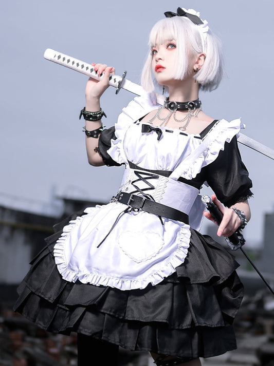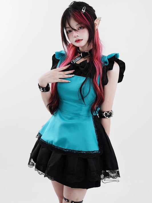 ダークラブレースショートメイドTシャツ+ゴシッククロスレースエプロン