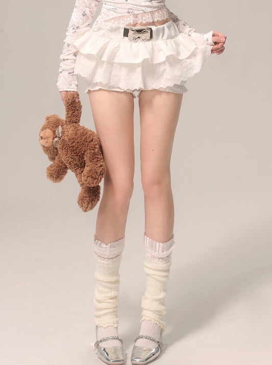 アイホワイトパールホワイトレースフレンチリボンフレアスカートパンツ