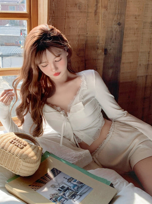クリーミーホワイトカーディガン+キャミソール+ショートパンツ