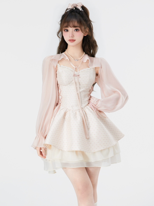 チェックリボンレースアップキャミソール+リボンティアードスカート