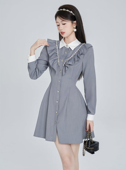 カレッジスタイルグレーダイヤモンドフリルシャツドレス
