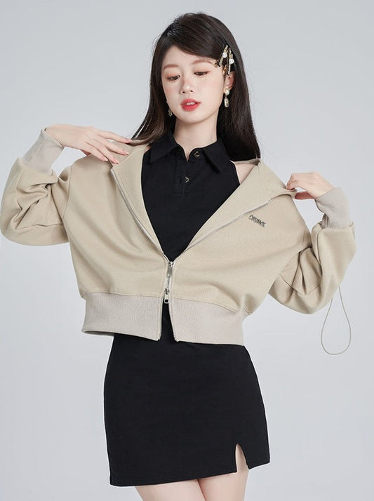 レーススタンドカラースウェットトップス+アシメチェックスカート