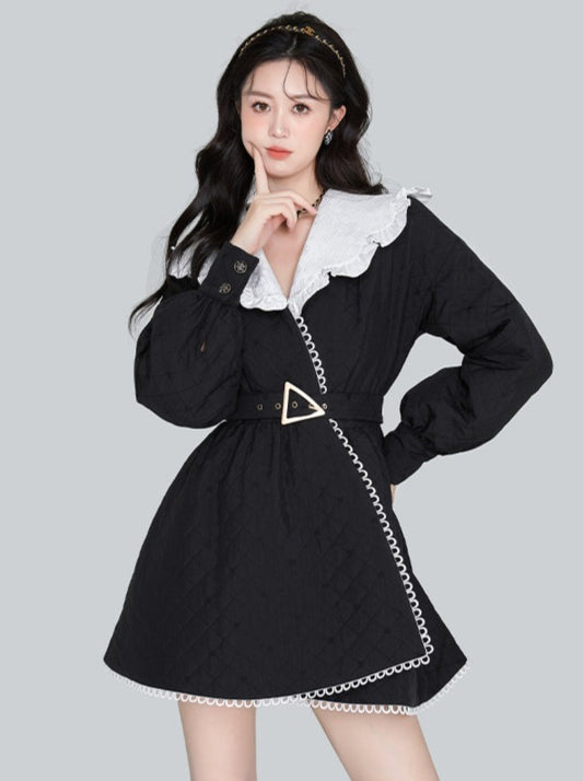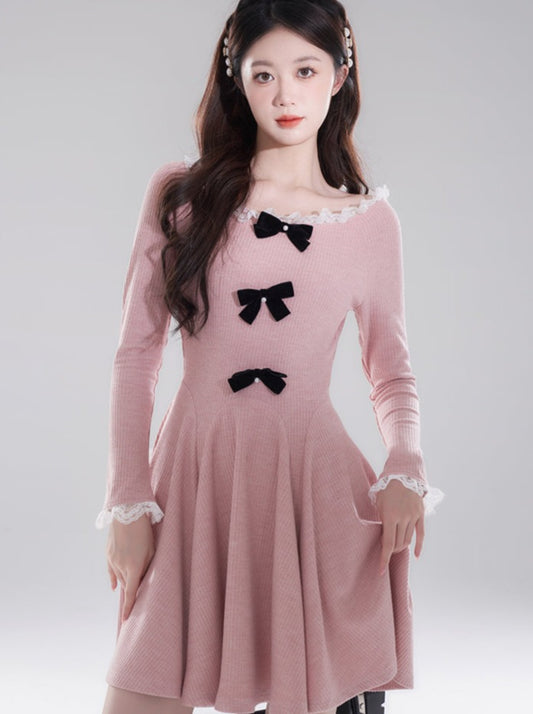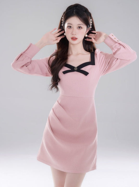 フレンチスクエアカラーピンクウエストリボンワンピース