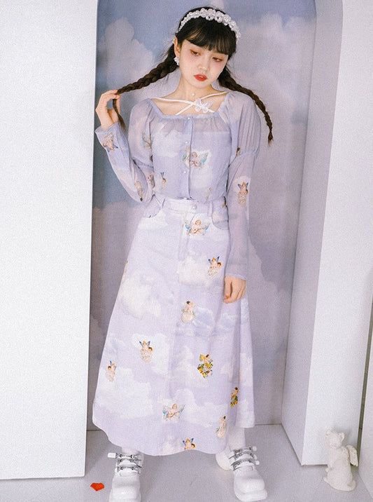 リトル エンジェルプリントガールレトロシフォンスクエアネックトップス