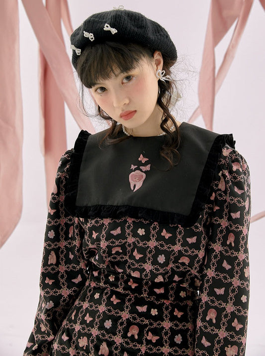 アンティークドールローズパールプリント パフスリーブルーズシャツ