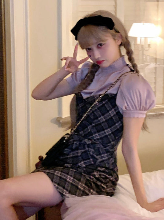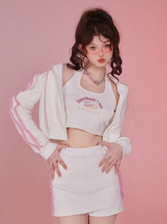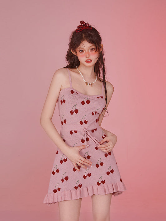 チェリースカートピンクニットカーディガンニットサスペンダーワンピースセットアップ