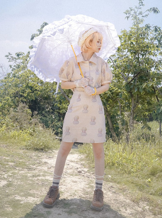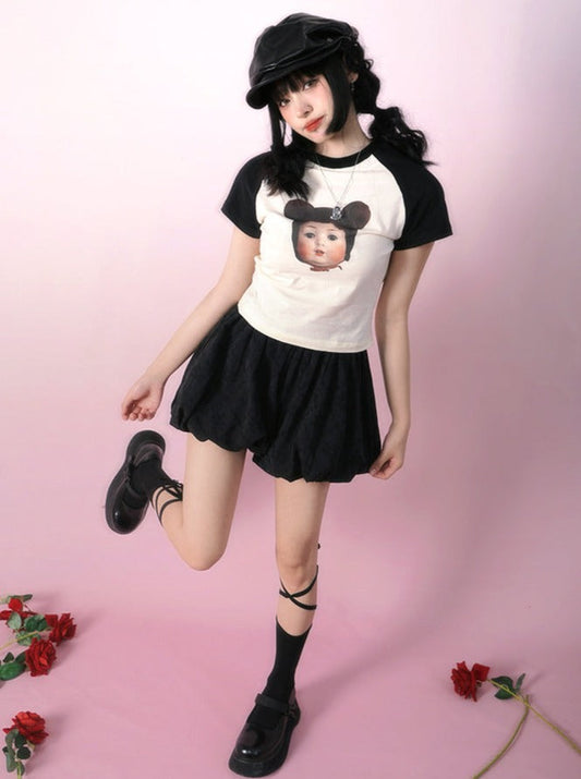 ベアドールアンティークドールブリントデザインツーカラーTシャツ