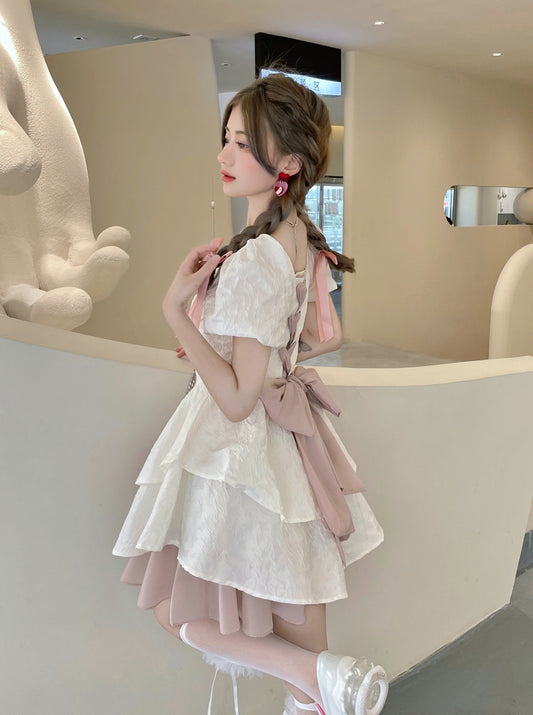 スクエアネックパフスリーブバックレースアップティアードドレス