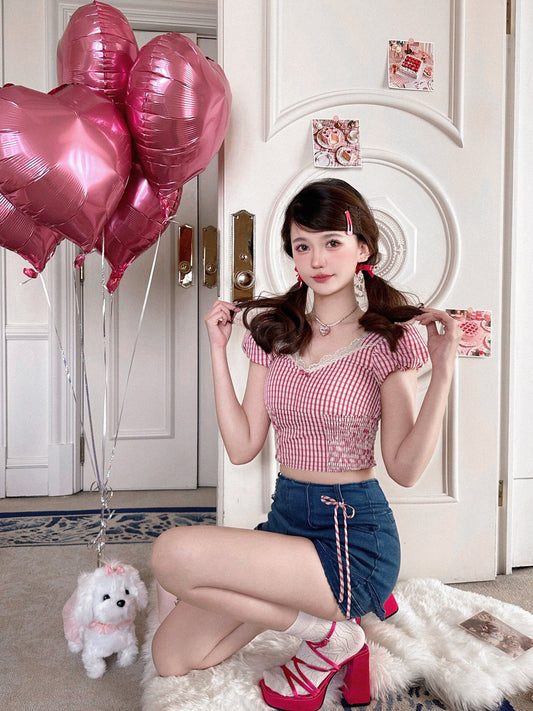 クリームストロベリーレースカラーリボントップス