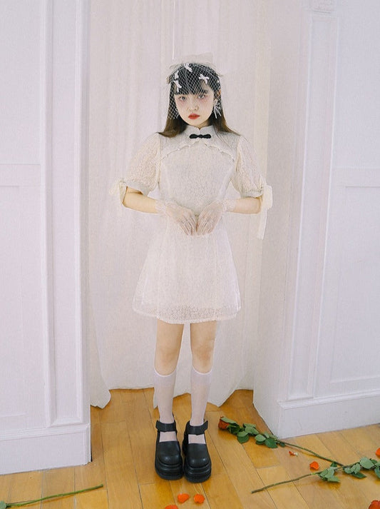 パールフラワーレースパフリボンスリーブバックレースアップチャイナドレス