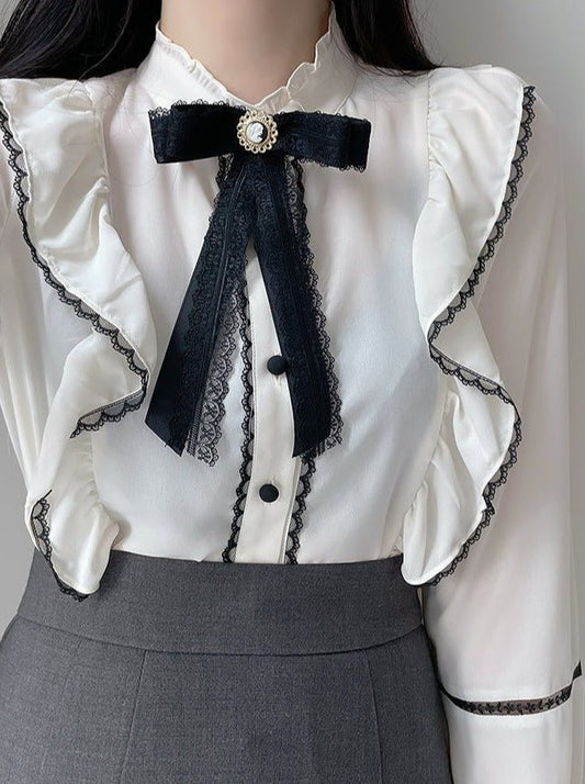 リボン付きフリルスタンドカラーラッフルブラウス