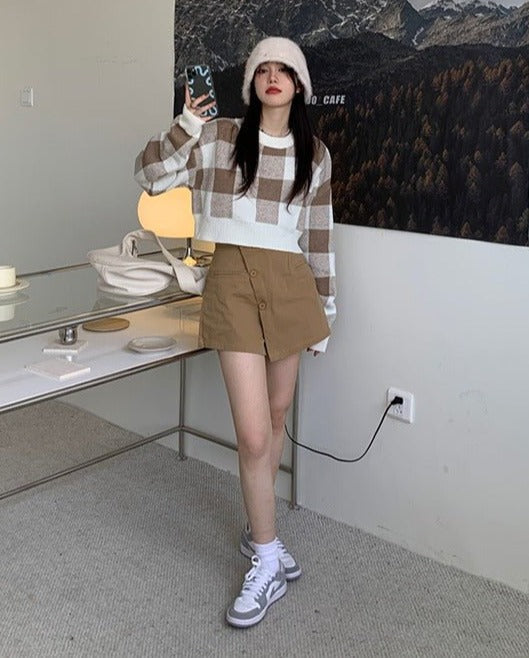 チェッククロップドニットセーター