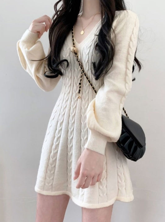 ケーブルニットVネックワンピース
