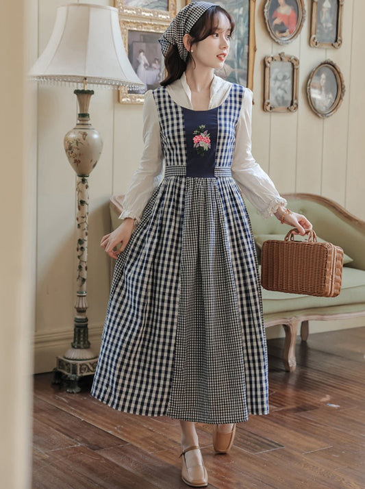ギンガムチェックフラワーレトロカントリーワンピース