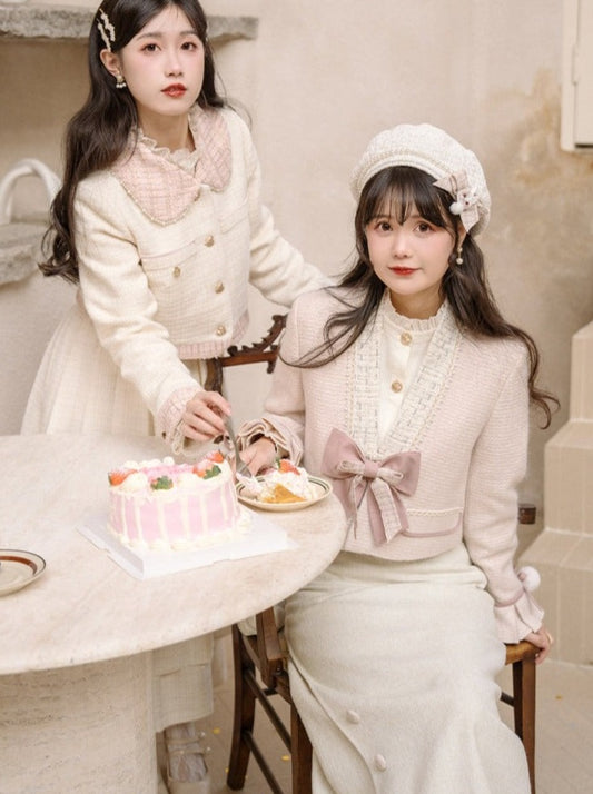 フリルブラウス+タイトスカート+ツイードリボンジャケット