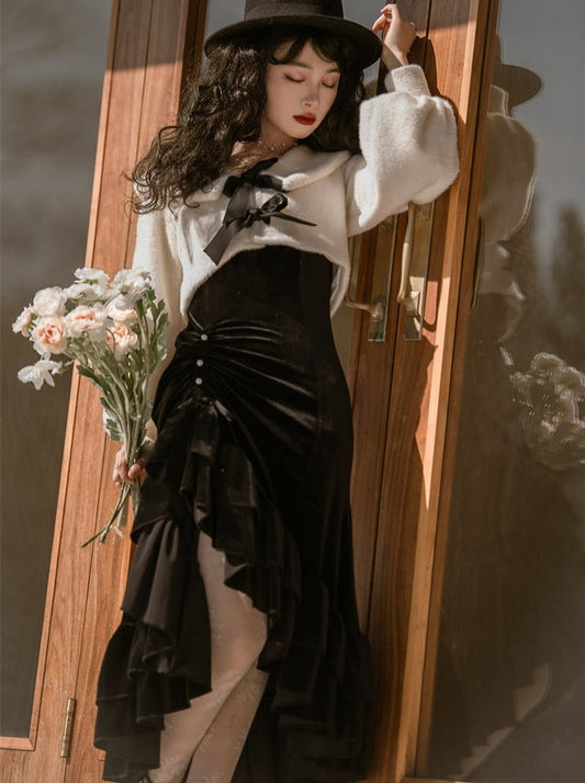 レースボウタイブラウス+ホルターネックバックレースアップフリルスカート