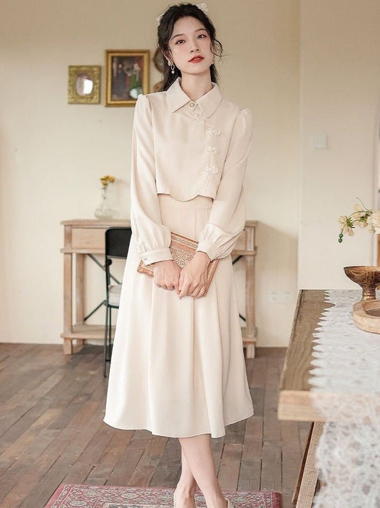 スタンドカラーダブルブレストガウンレースエプロンオーバースカートセットアップ