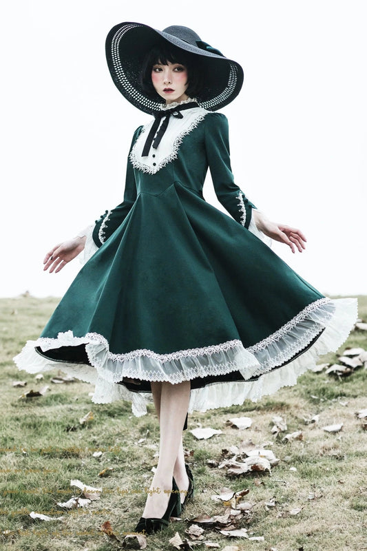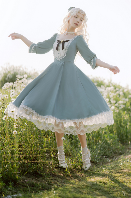 【予約商品】レトロビブカラーエレガントブルーイレギュラースカートドレス