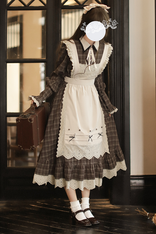 【予約商品】ブラウンチェックレトロワンピース+エプロン
