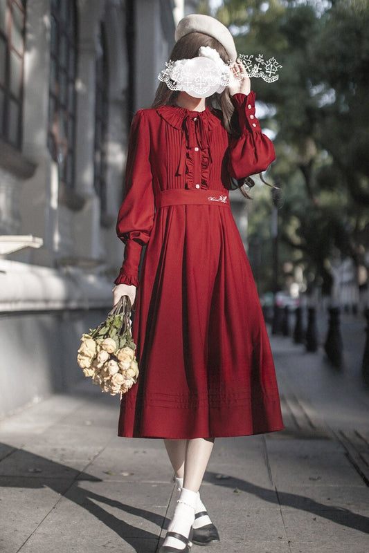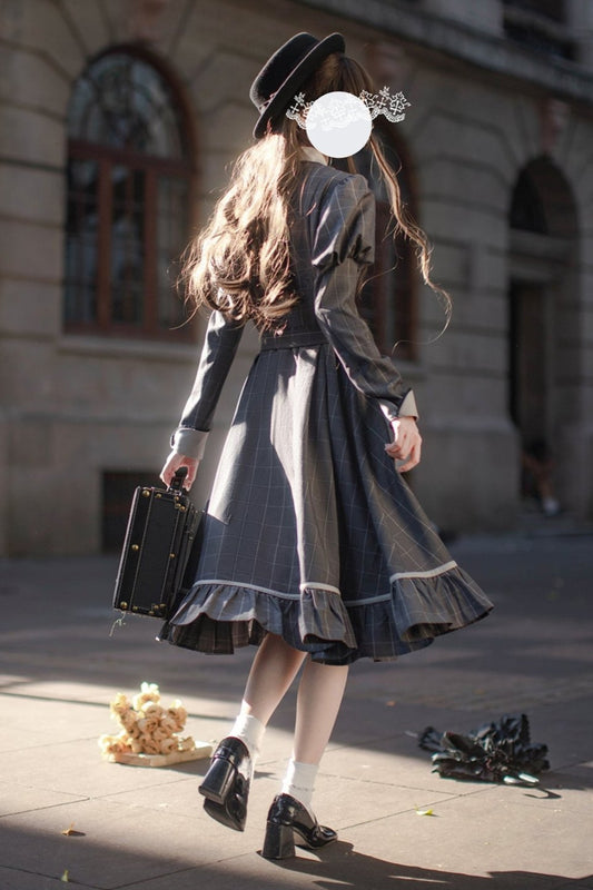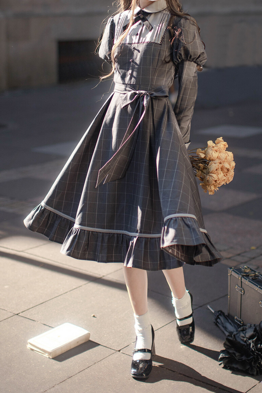【予約商品】レトログレーチェックエレガントパフロングスリーブドレス+クロスタイ